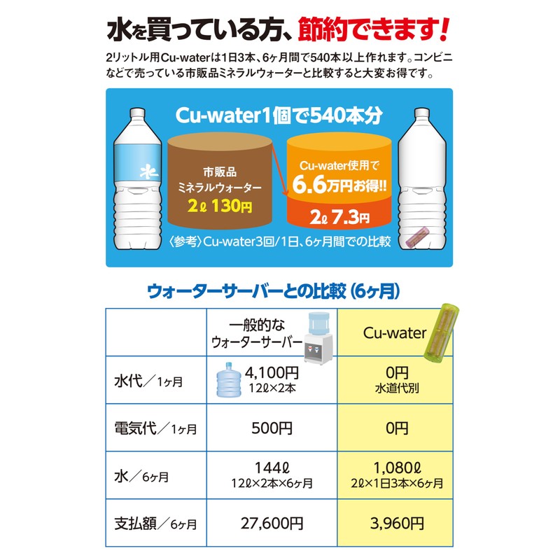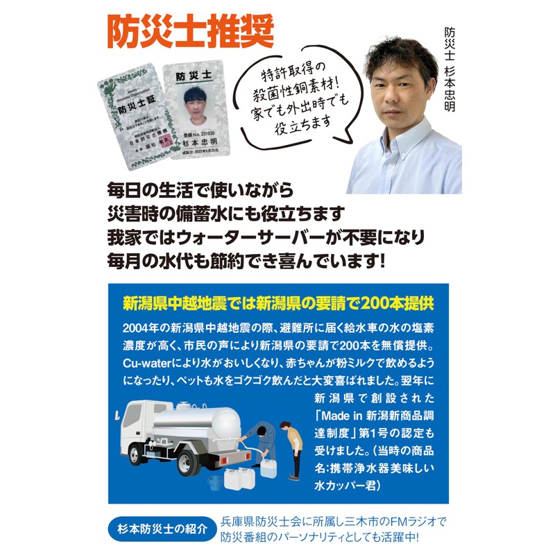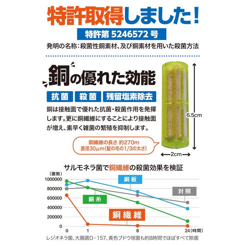 - Cu-water quill is a portable water filter containing copper fiber with a patented technology sterilizable copper material (patent No. 5246572) to quickly maximize the antibacterial and residual chlorine removal properties of copper