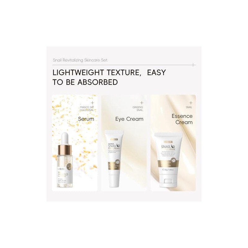 LAIKOU - Cuidado de la piel coreano, conjunto de cuidado de la piel, kit de cuidado de la piel caracol y ginseng con crema para ojos, suero, crema esencia 3 piezas para mujeres, adolescentes, niñas, mamá, hija, día de la madre, cumpleaños. ✅ Diseño innovador que supera las expectativas. Materiales de alta gama y acabados premium. ⏰ Oferta por tiempo limitado. Ideal para quienes buscan lo mejor en calidad y estilo. Producto auténtico con satisfacción total asegurada. ¡No te quedes sin el tuyo y aprovecha esta oportunidad única!