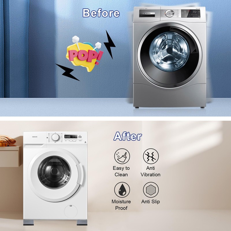 - Wide Application: Shock and noise-canceling washing machine support anti-vibration rubber pads can be used not only for washing machines and dryer but also for household appliances, beds, sofas, table legs, chair legs, closet legs, sofa legs, ncrease the height of the appliance and furniture to prevent moisture and make cleaning easier.