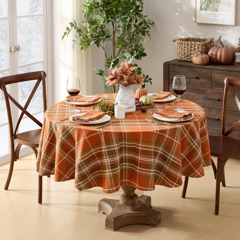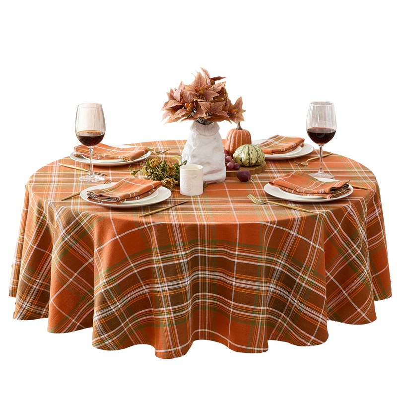 - STYLING: The Country styled Cottage Farm Plaid Autumn and Thanksgiving 100% Cotton Fabric Tablecloth feature an allover bold scale woven block plaid in square of rust, brown, green and golk with a subtle waffle check texture.