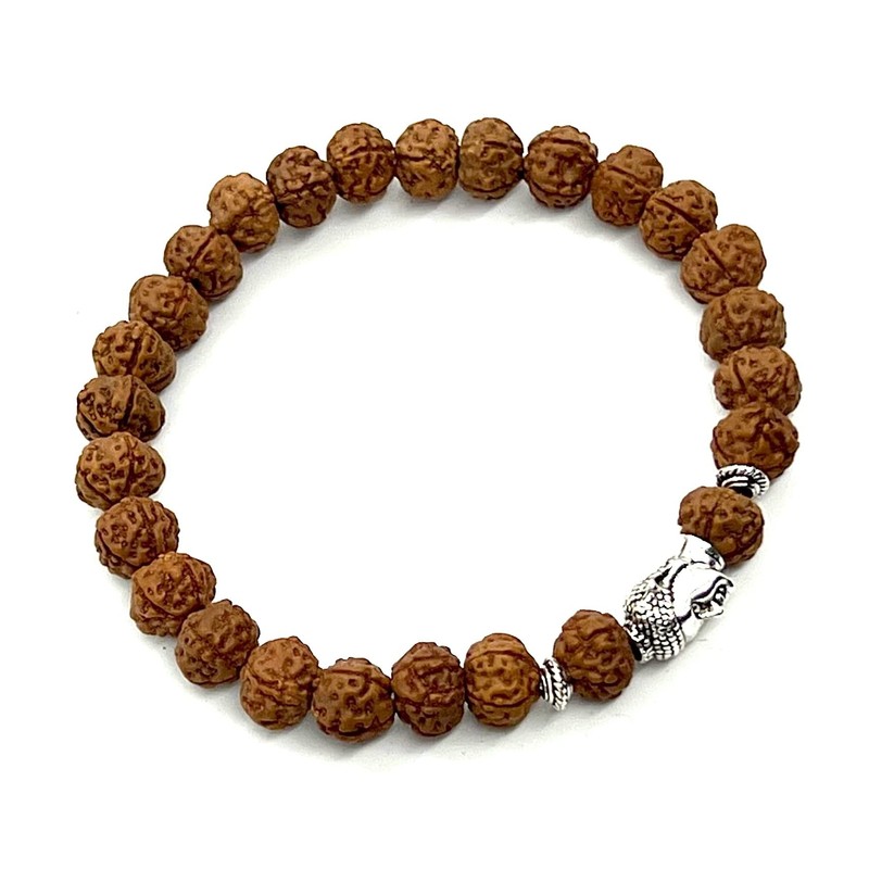 - Embrace Spiritual Connection & Find Harmony on Your Journey Deepen your connection to your spiritual self and cultivate inner peace with this beautiful, handmade stretch bracelet. Featuring substantial 8mm 5 Mukhi Rudraksha beads and accented with a calming zinc alloy Buddha head charm, this bracelet offers a stylish and meaningful way to promote Root Chakra balance and spiritual well-being (approximately 7.5 inches wrist size).