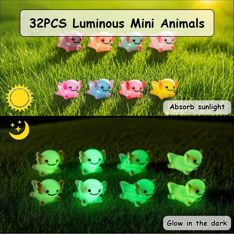 Cumnvulnt 32PCS Mini Resin Axolotl Luminous Miniature Figures Mini Resin Animals Figures Glow in the Dark Animals for Garden Aquarium Dollhouse Party Decor