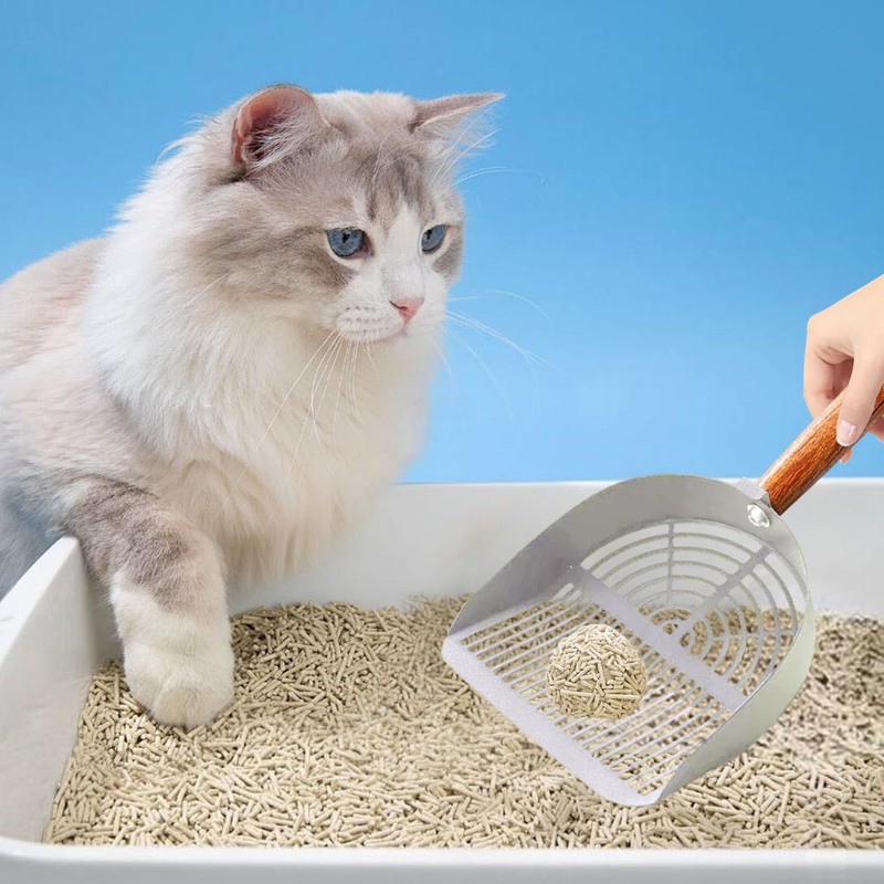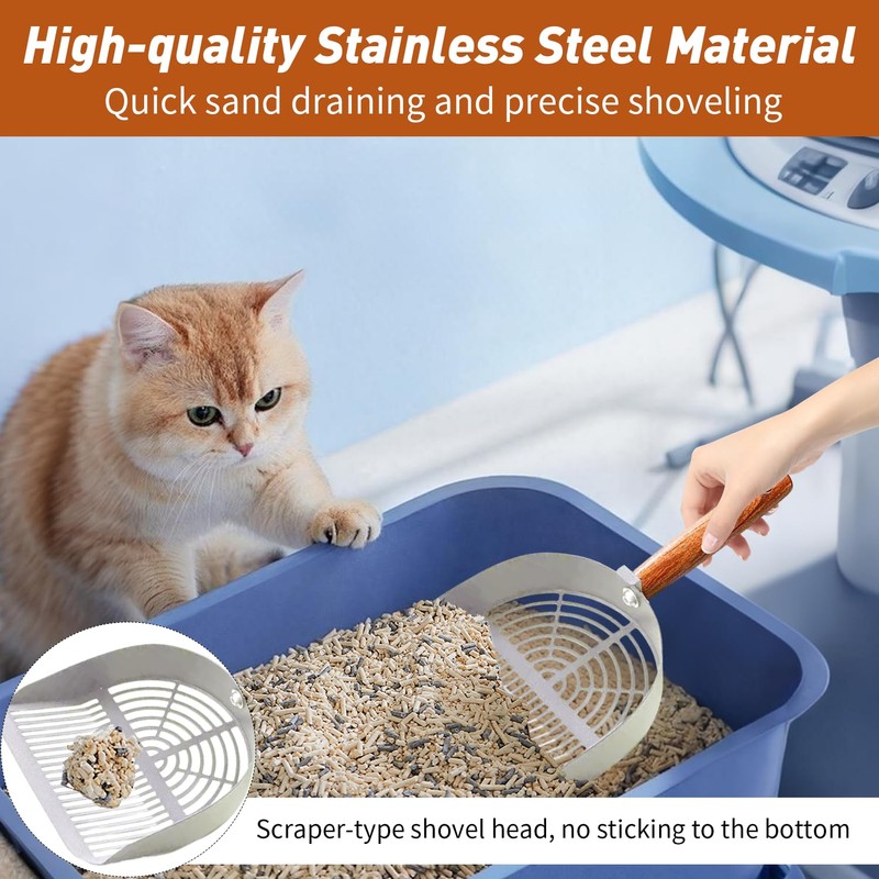 Cunegra Stainless Steel Cat Litter Scoop, Metal Cat Litter Scoop with Wooden Handle, Easy to Clean Cat Litter Scooper with Dual-Width Holes Suitable for Clumping Litter