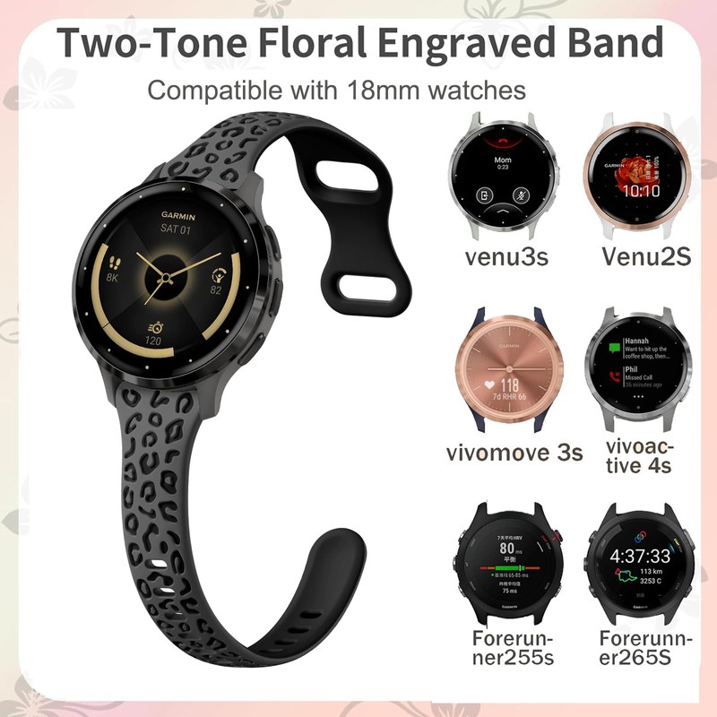 CUNUJIX Leopard Engraved Slim Silicone Watch Bands Compatible with Garmin Venu 3s/Vivoactive 4s/ Venu 2s/ Vivomove 3s /Forerunner 255S/265S, 18mm Cute Thin Soft Strap Wristband for Women Men