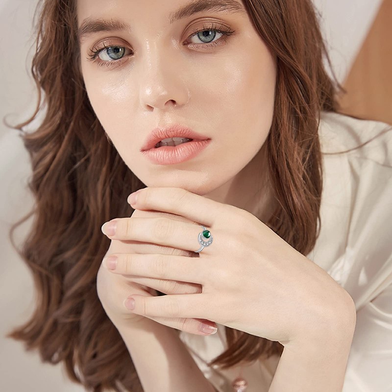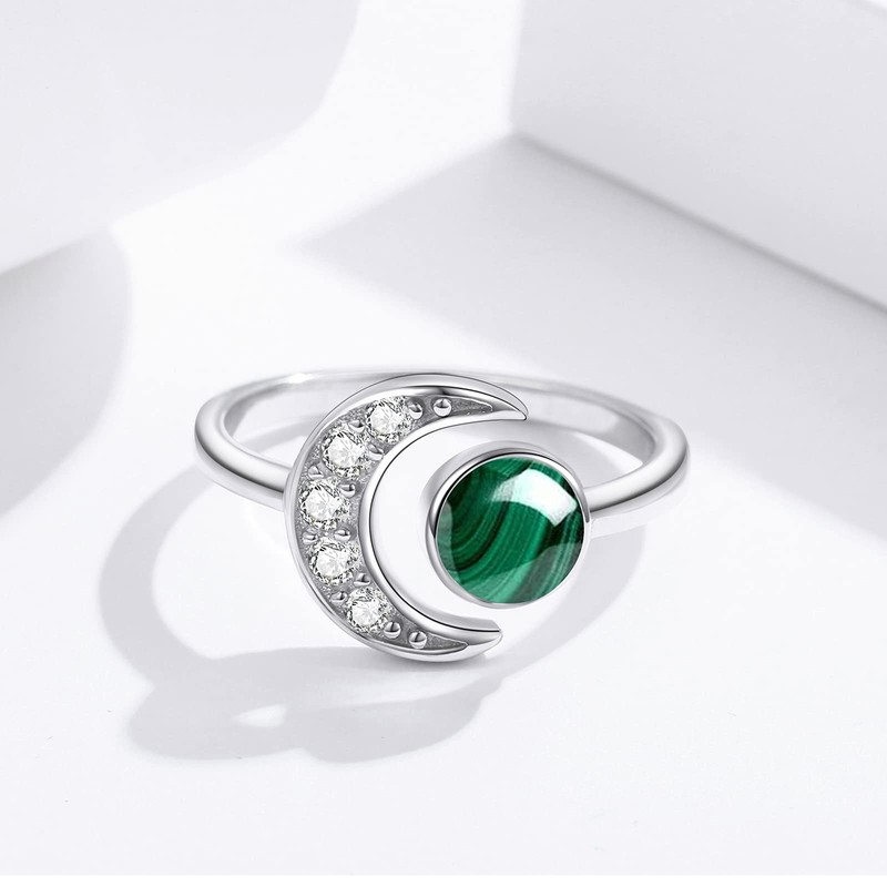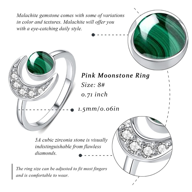 - Special Design:5A small Cubic zirconia and malachite accentuate each other perfectly ,mounted firmly and very sparkly. Quiet sophistication with mystic femininity; The “woman in the moon” Stands for the Romantic Love. Hope everyone received this gift moon malachite ring will be happy and healthy lifetime.