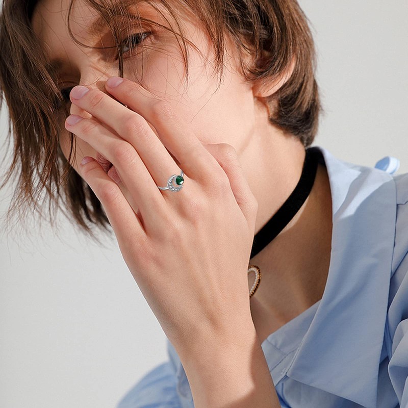 CUOKA MIRACLE Moon Ring, S925 Sterling Silver Crescent Moon Ring Open Ring Adjustable Ring Gift for Women, Metal, Malachite