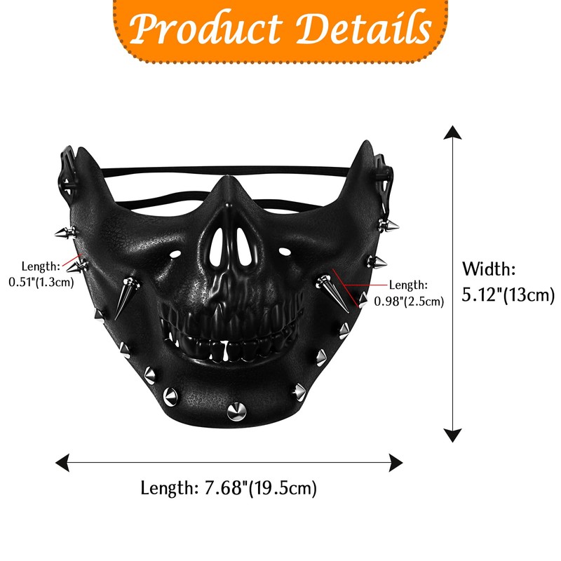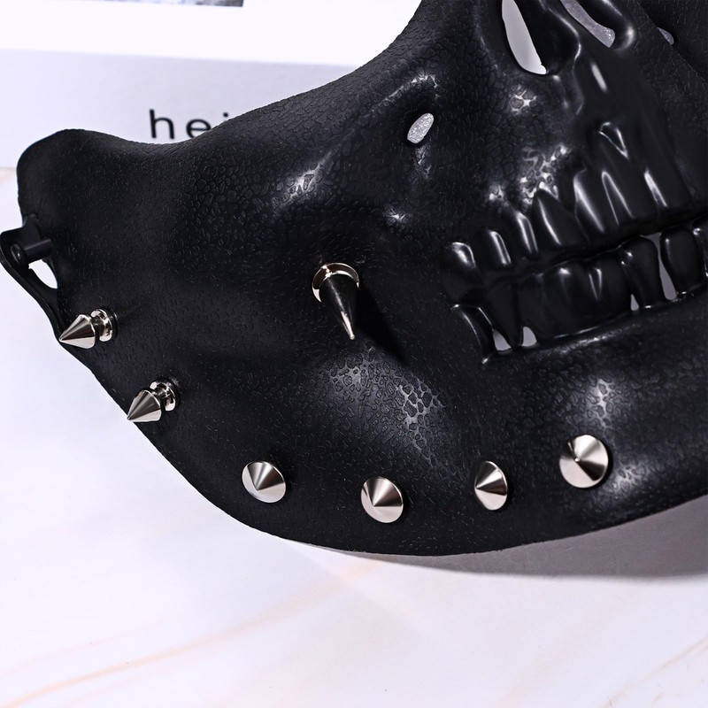 - STRIKING STEAMPUNK DESIGN: This black skull half face mask with distinctive spikes and clear contours gives you a cool, rebellious look. Combining elements of danger, strength, mystery, gothic and grief, it is ideal for anyone looking for a fearsome and stylish appearance. Perfect for Halloween, theme parties or cosplay events