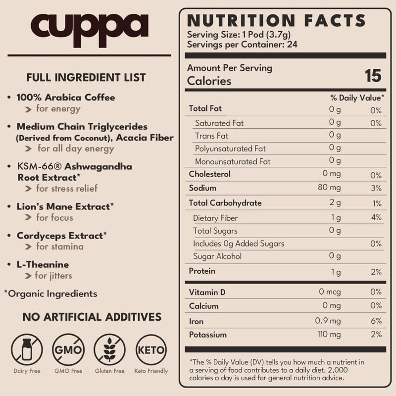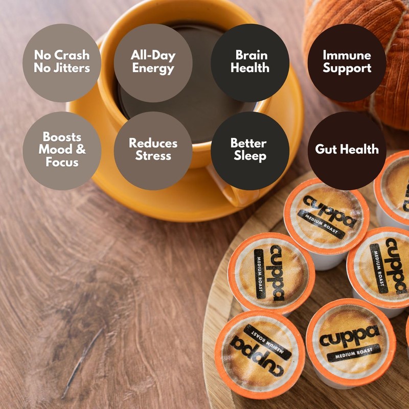 Cuppa Healthy Mushroom Coffee Single Serve Pods (K-Cups) with Lion's Mane & Ashwagandha for All Day Energy & Focus - No Crash or Jitters - Nootropics for Brain Health, Gut Health, Immunity, Stress, Memory + Mood - 24 Servings
