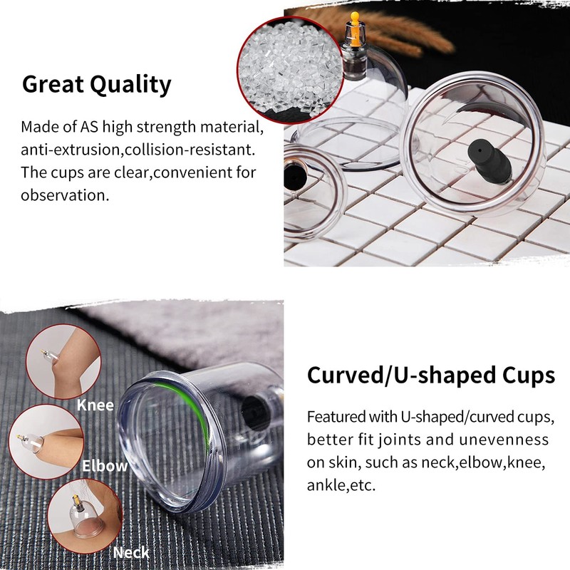 - 【Benefits of Using Cupping Therapy Sets Hijama】:Cupping sets are generally used on the shoulders, neck, back, thighs, etc..The arc design of the special U-shaped joint cup mouth can be better adapted to each joint,it is used for elbows, knees, ankles, etc. and has better contact and is not easy to fall off.Cupping sets are used to relieve back, neck and leg pains by placing cups on massage points of your body, which helps loosen muscles and cellulite, etc..