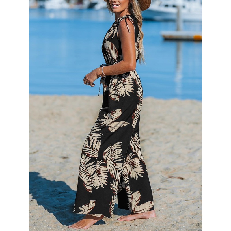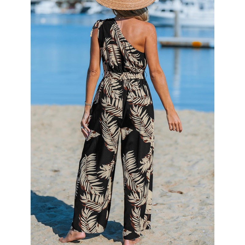 CUPSHE Women's Jumpsuit One Shoulder Sleeveless Overalls Drawstring Tropical Wide Leg Playsuit with Belt Summer Loose Trouser Suit, Black print