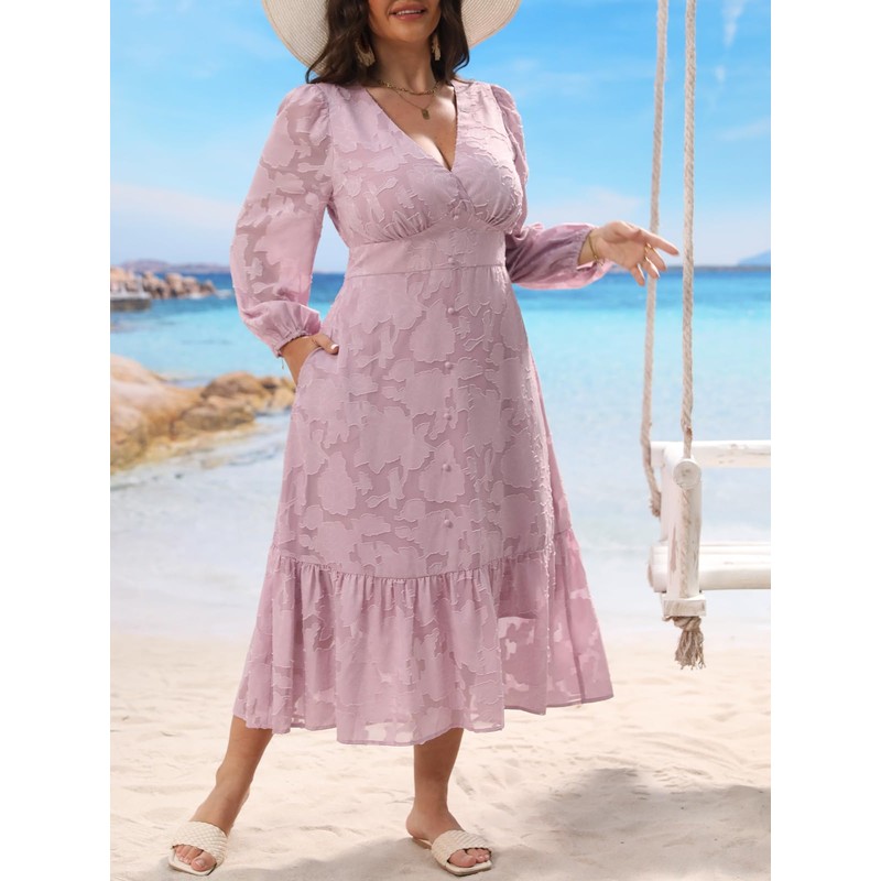 - 【Features】: Plus size in lace maxi wedding guest dress 2024 with v neck design, It’s got long sleeve, lace fabric, high waist, ruffled hem, pleated detail, button emblishment, flowy, a-line and maxi length, that’s all about comfy vibes, whether you’re out for a stroll or chilling by the beach in autumn. The plus size is good for to shape your figure and flounce hem add a touch of whimsy, making it perfect for sunny days.