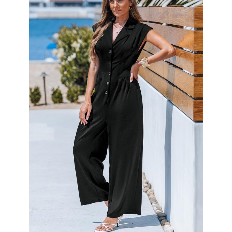 CUPSHE Women's Summer Sleeveless Button-Up Jumpsuit Revers V Neck Elegant Wide Leg Overall Casual Outfit