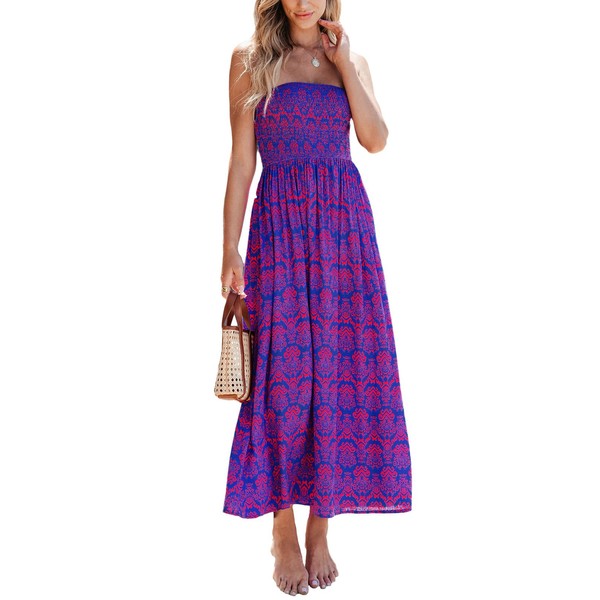 - [Unique Design]: Embrace free-spirited style with our Boho Smocked Bodice Tube Maxi Dress. This enchanting piece features a smocked bodice that hugs your curves comfortably, extending into a flowing maxi-length skirt.