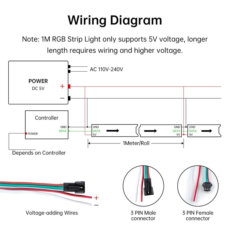 - Note: If you need to connect longer light strips, add transformers if necessary to ensure all beads work properly. As individually addressable LED strips are used in a variety of applications, these LED strips are not sold with a fixed controller, please purchase the appropriate controller as needed.