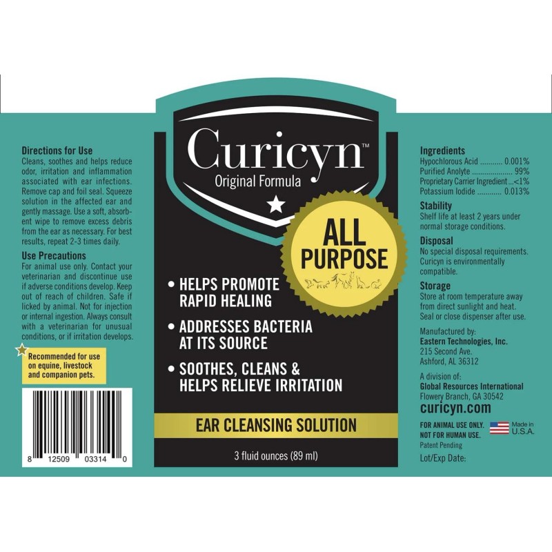 Curicyn Ear Cleansing Solution, 3 oz.Curicyn fast acting Ear Cleansing Solution is the Original Formula modified to make it more suitable for animal ear application. It is packaged in a 3 oz. twist open dropper bottle. The Curicyn Ear Cleansing Solution addresses bacteria at its source, helps reduce inflammation, cleans and helps relieve irritation associated with ear infections. Cleans and aids in the prevention of a variety of ear related issues in all animal species. Will not burn or sting when applied._x000D_ Recommended use: ear cleanse/wash, ear irritations and/or injuries, ear infections from yeast or mites, ear infections from bacteria, irritations caused by moisture.