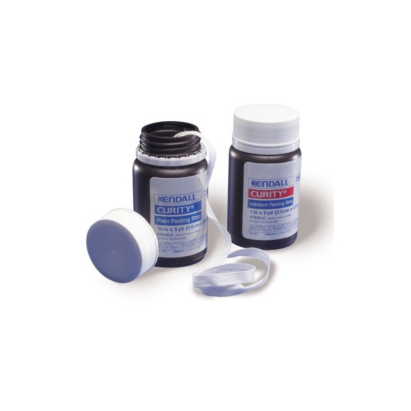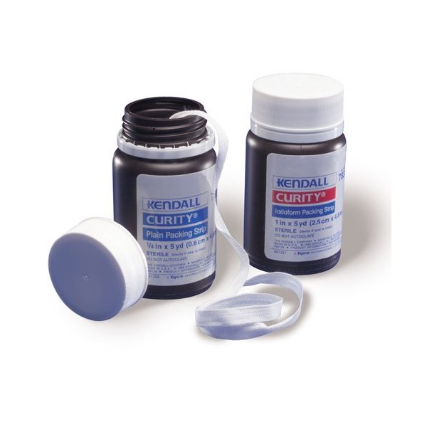 Kendall Curity Sterile Packing Strips are crafted from all natural 100% fine mesh cotton gauze and are available plain or with iodoform compounds for enhanced disinfectant properties. Ideal for wet-to-dry packing, Curity Packing Strips are durable and versatile for a variety of applications. Covidien Sterile Packing Strips are available in 5 yard strips for a variety of wound sizes.