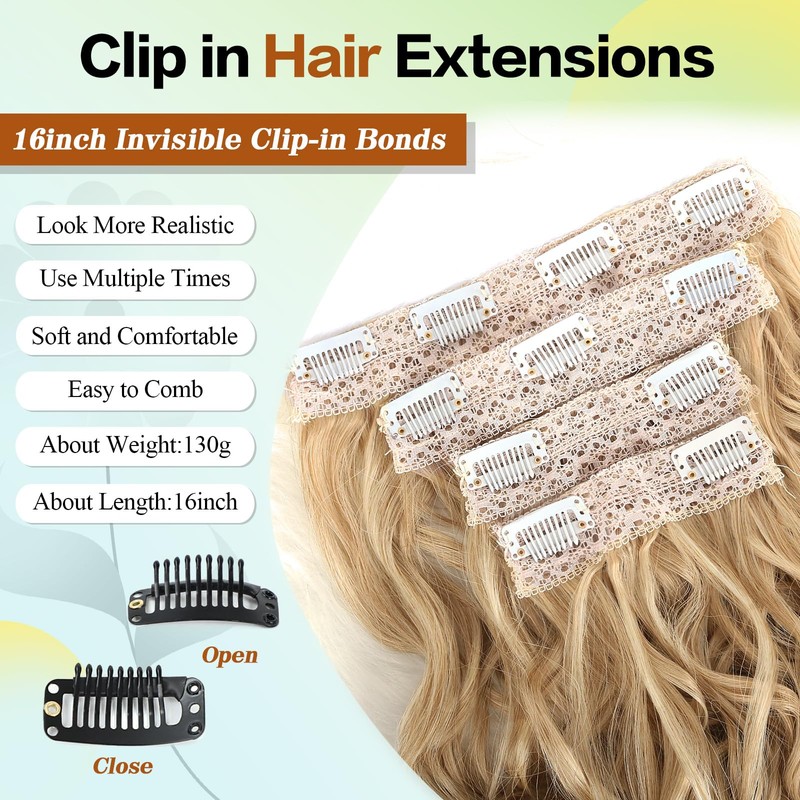 Curly Hair Extensions,LEOSA 4PCS 16 inch Clip in Hair Extensions Short Soft Natural Hairpiece Lace Weft Curly Wave Clip Ins Extensions Invisible for Women,Glden Light Blonde with Highlights
