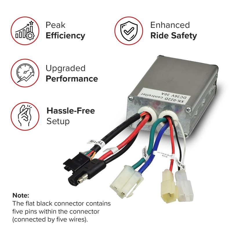 ► This 36 Volt 30 Amp diagnostic voltage controller is manufactured with a Smart Power Microprocessor and the controller is fully waterproof, with a brake inhibit power cut off. ► 5 Pin Throttle Connector: This controller comes with five connectors for easy installation. Note that the flat black connector contains five pins within the connector (connected by five wires).