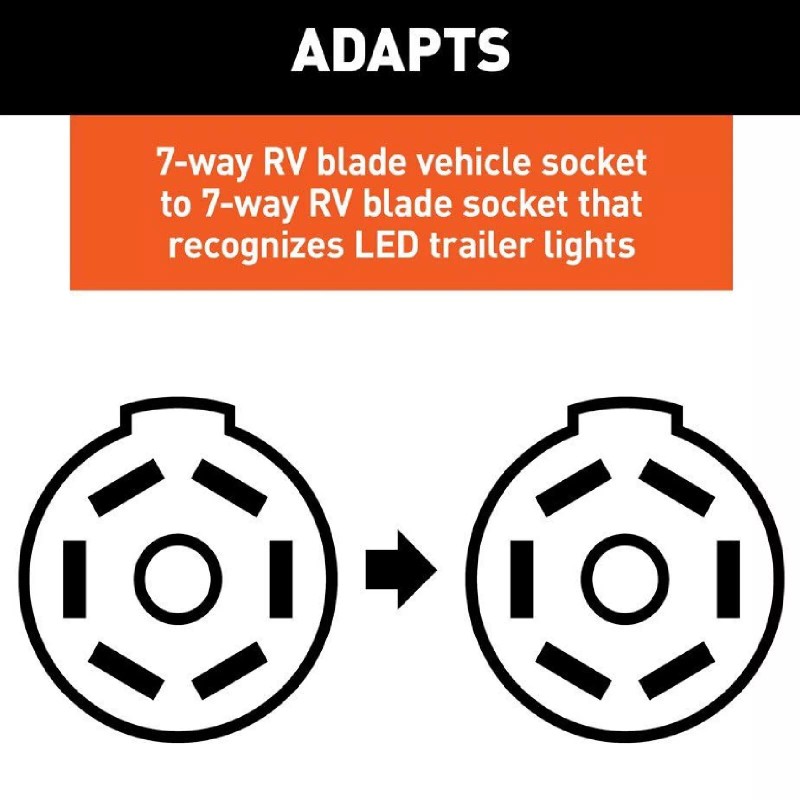• Enables vehicles with a 7-way RV blade socket to recognize LED trailer lights • Built-in, integrated resistors for computers that don't recognize LED lights • 7-way connects tail, brake, reverse, turn signals, brakes and auxiliary power • Simple plug-and-play design eliminates the need for cutting or splicing • Spring-loaded dust cover keeps connector clean when not in use Notes: • Not intended to be used as a wiring extension |