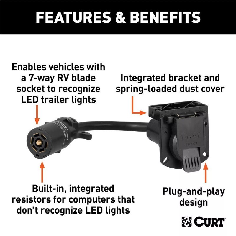 This special trailer light adapter is designed to plug into an existing 7-way RV blade socket to allow the vehicle to recognize LED trailer lights. It features built-in resistors for vehicles with computers that don't recognize LED lights and enables them to be compatible with trailers that have them. It is not intended to be used as a wiring extension. This 7-way RV blade adapter requires no splicing and is a custom wiring option for certain years of the Porsche Cayenne, Audi Q7 Quattro or Volkswagen Touareg or VW Colorado (to verify your vehicle compatibility, see the CURT application guide at curtmfg.com). All CURT wiring and electrical products come with a one-year limited warranty to give you the assurance you need to tow with confidence.