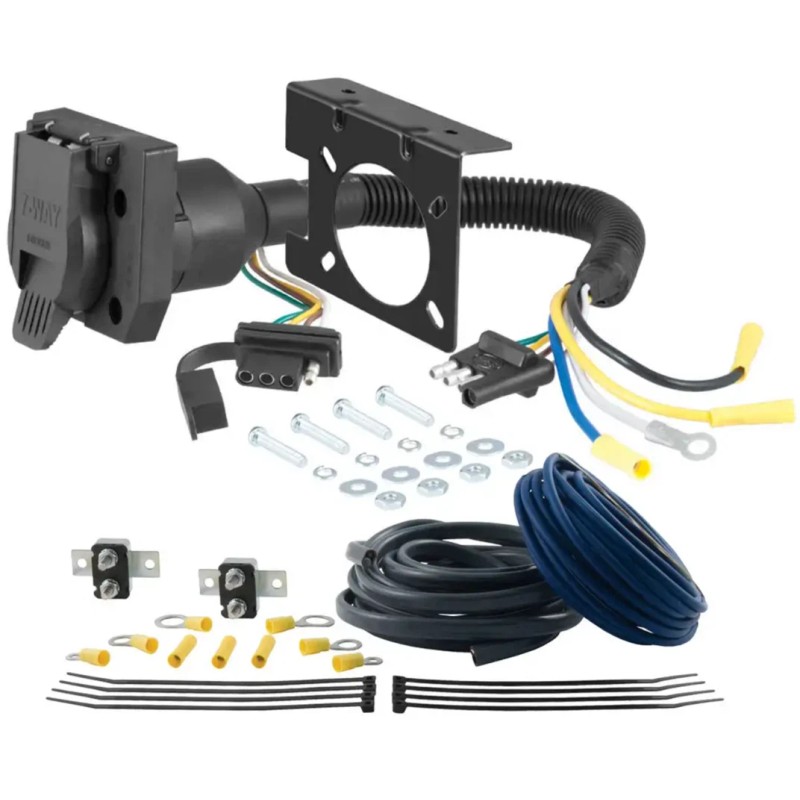 Upgrade your towing setup with the ultimate conversion kit Transform your vehicle’s 4-way flat socket into a 7-way RV blade with ease This kit includes the CURT dual-output electrical adapter, trailer brake controller wiring kit, and a 30-amp universal circuit breaker.