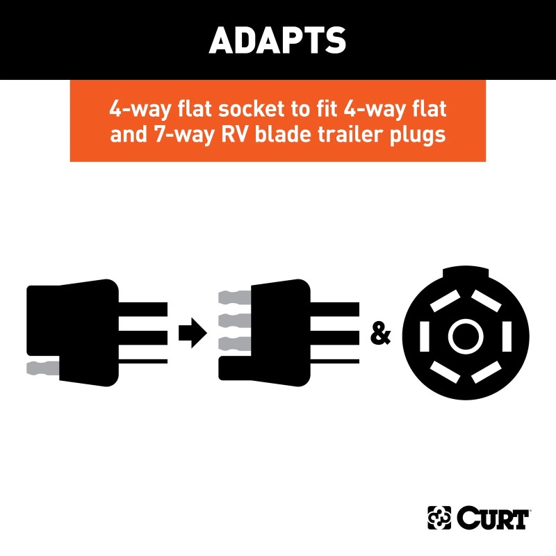 - Adapts a 4-way flat socket to fit 4-way flat and 7-way RV blade trailer plugs