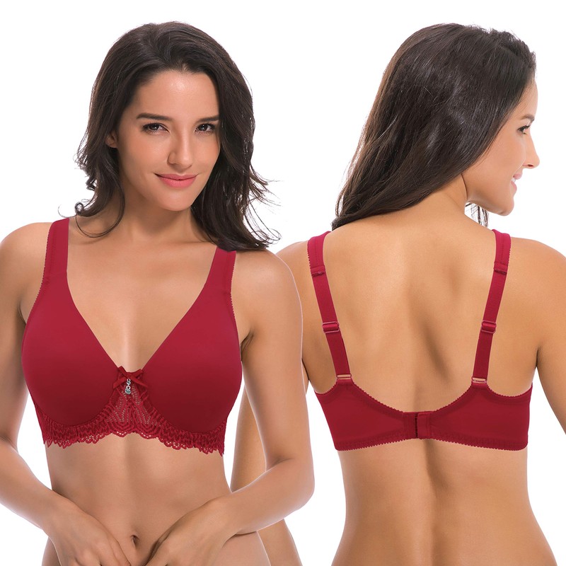 Curve Muse Women's Plus Size Unlined Underwire Lace Bra with Cushion Straps-2PK-Dark Red,Nude-40DDDD