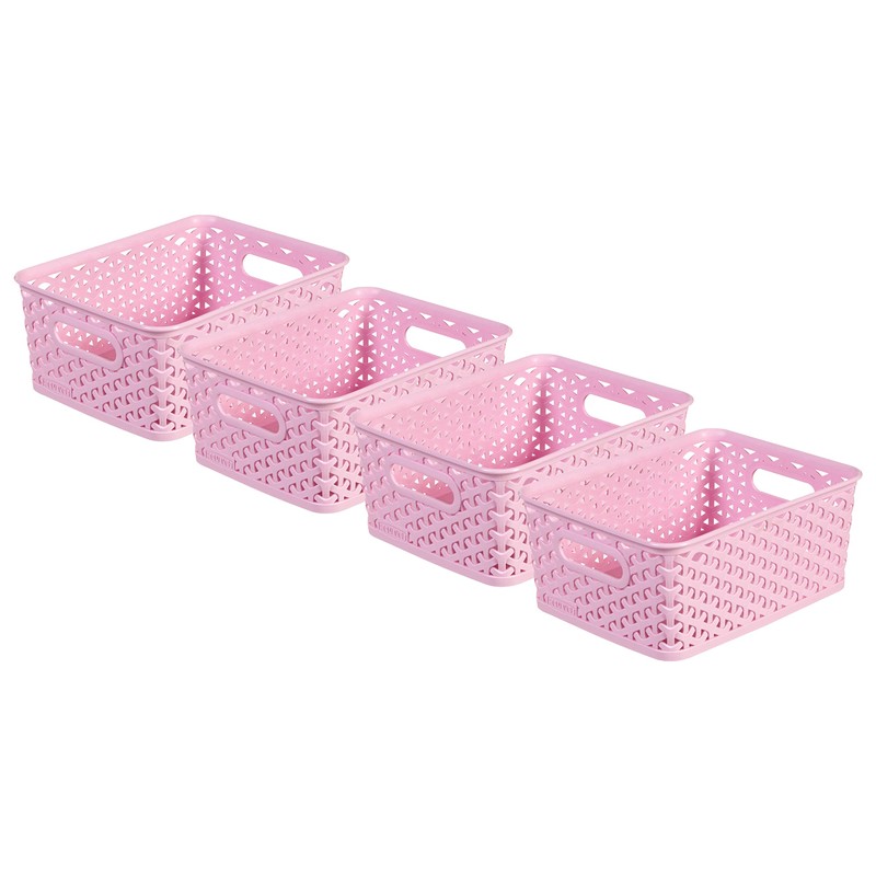 Curver My Style Rattan Effect Set of 4 Kitchen, Living room, Bathroom, Bedroom, Utility Small Rectangular Storage Baskets 4 Litres - Pink