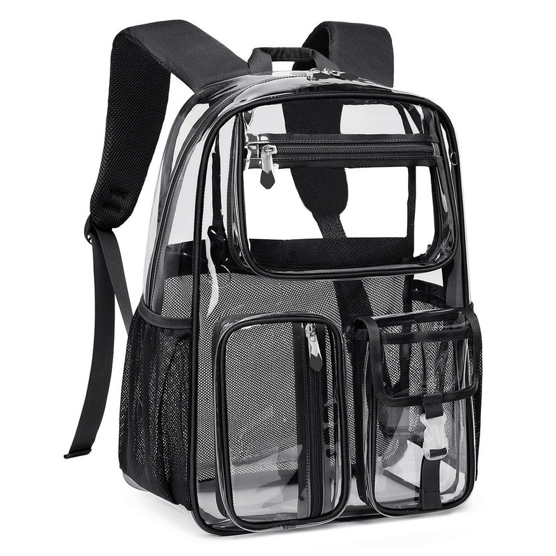 - transparent Bookbag Applicable Security Checks -- Heavy duty clear backpack maintains the security and easy accessibility of all your valuables and accessories. Its see-through design enables you to swiftly pass through security checkpoints without unnecessary delays.