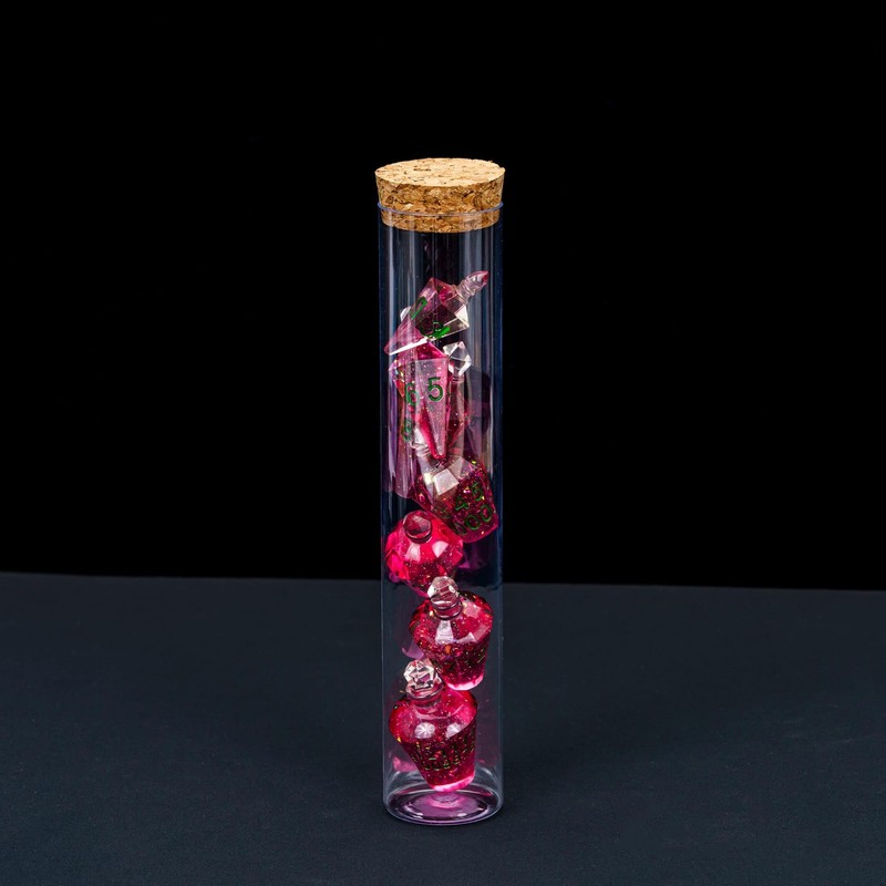 Cusdie 7-Die Sharp Edges DND Dice Set, Potion Shaped D&D Dice, Handcrafted Polyhedral Dice Set, Potion Dice for TTRPG Role Playing Game Pathfinder(Pink w/Green Numbers)