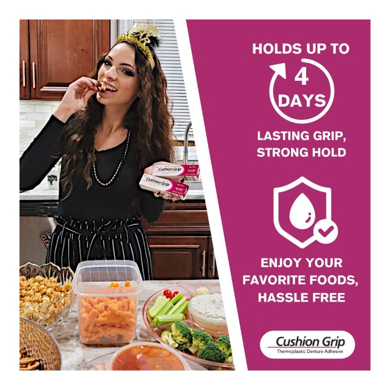 Get a Long-Lasting, Comfortable Hold for up to 4 Days with a Single Application! Cushion Grip fills gaps for a snug fit, acting as a soft reline to secure loose dentures and partials between refitting appointments.