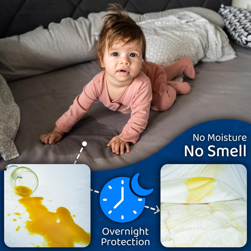 - For Busy Moms with Little Ones – Protects mattress from vomits, diaper leaks & bed-wettings. This toddler mattress protector saves you time & effort by keeping those heavy pee stains away, so you don't have to scrub & clean after each mishap.