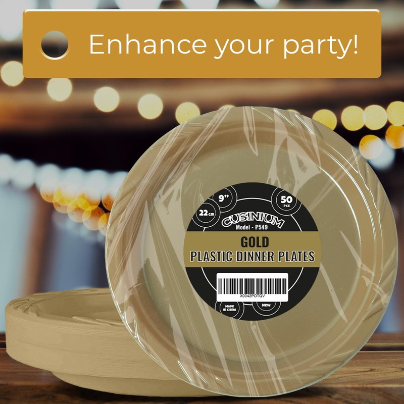 - Set Сontent: 50 disposable gold dinner plastic plates, 9 inches