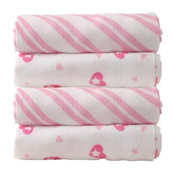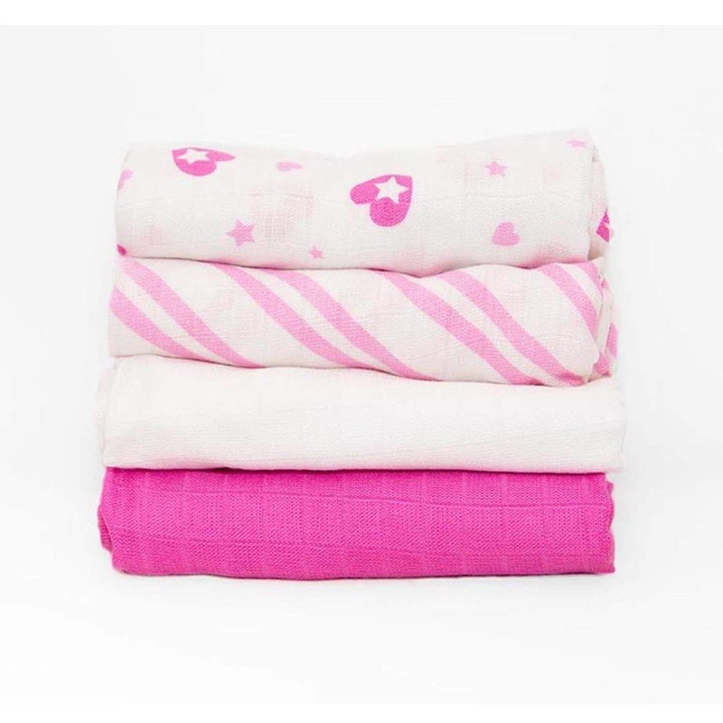 Cuski Super Soft Bamboo Muslins x 4 (Jolie Hearts), Pink, 60 x 60 cm