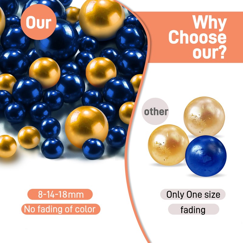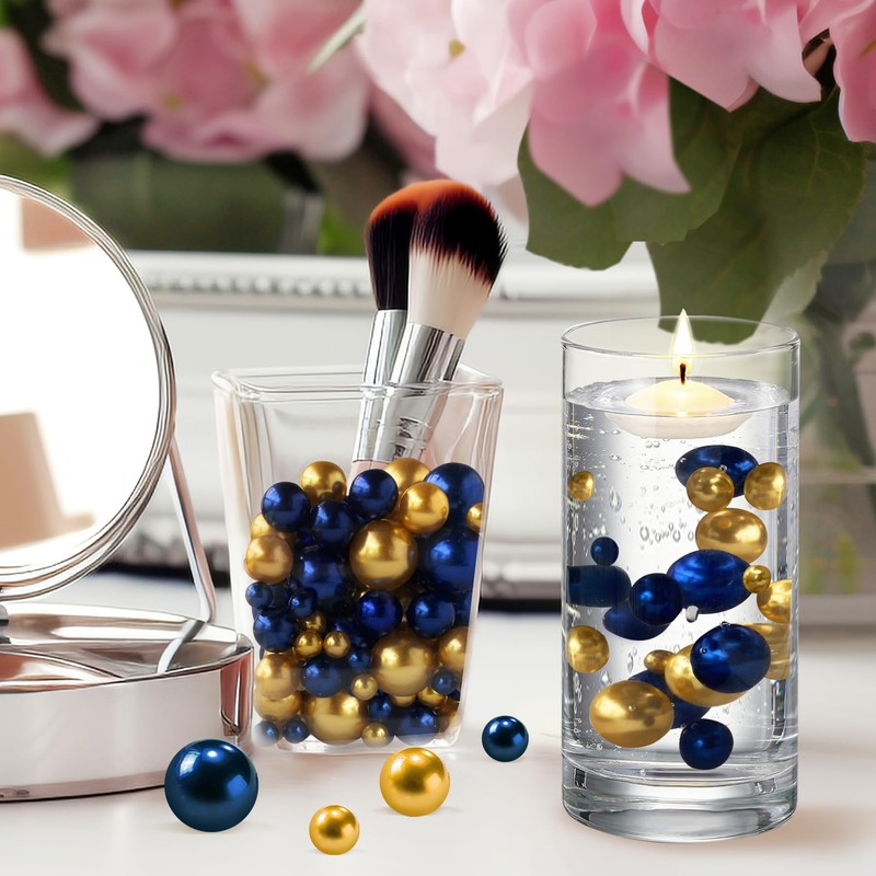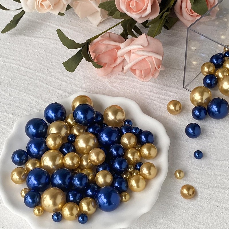 Cusmation 510Pcs Navy Blue Gold Vase Filler Pearl Beads for Centerpieces Vases, 8/14/18mm No Hole Faux Polish Pearls for Floating Candle Home Birthday Wedding Table Decor