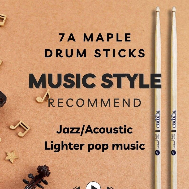 - Durability and Longevity: Crafted from the heart of maple wood for denser, more durable 7A drumsticks, ensuring long-lasting quality. Compare with hickory, oak ect..wood material, maple wood is lighter, suitable for Jazz latin ect upbeat music style
