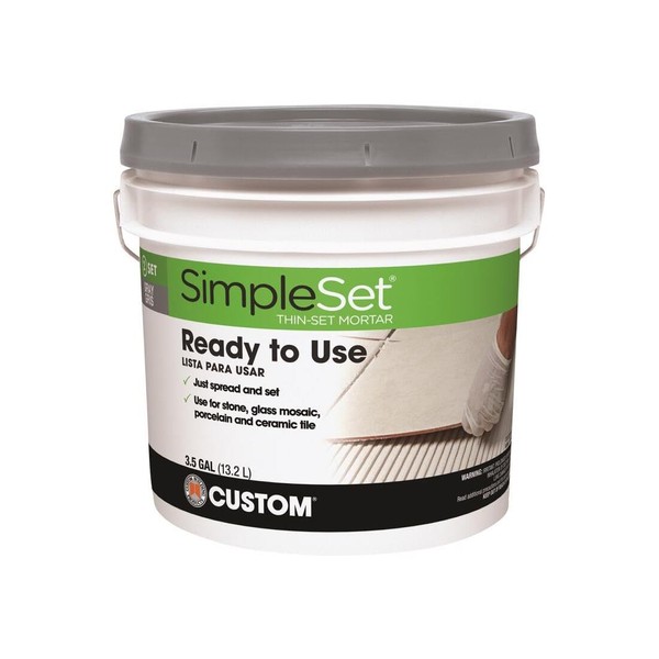 3.5 gallon, pre-mixed ceramic tile Gray thin set mortar, this no mix, no mess alternative to traditional thin set mortars spreads quickly & easily, bonds ceramic tile up to 18" x 18", for interior wall & floor installations, protected by moldgard technology exceeds ansi A136.1 type I.