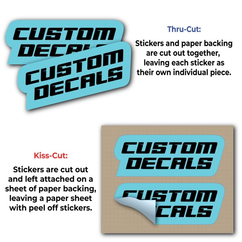 - We Will Cut Your Stickers To The Shape Of Your Choice. Kiss-Cut Is When The Decal Is Cut, But We Don't Cut Through The Backing Paper. This Will Leave Your Decals On Sheets. Through-Cut Will Cut All The Way Through The Decal And The Backing Paper.
