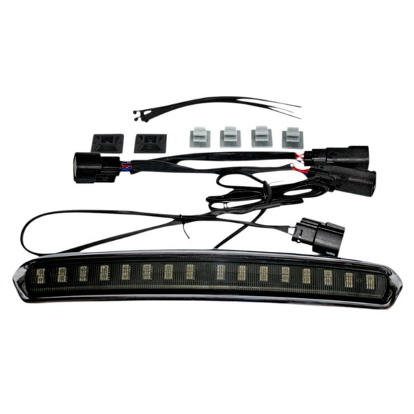 Add decorative visibility to the rear of your bike with the addition the Custom Dynamics High Mount Tour Pak LED Light, which is designed to be compatible with Harley-Davidson Tour Pak trunks. Unit comes pre-taped to adhere to the top of the Harley-Davidson 2014-current King & Chopped style tour paks. Includes plug and play wire harness for simple installation adding 32 50/50 LEDs for run and brake with 16 LEDs per side for red turn signal on most models.On certain models the light will function as run and turn only, see more fitment details below. Available with a chrome or gloss black finish with a red or smoked lens. Lifetime LED Warranty. Fits 2014-2023 Harley-DavidsonUltra Limited (FLHTK), 2022-2023 CVO Road Glide Limited (FLTRKSE), 2020-2023 Road Glide Limited (FLTRK), 2014-2019 Electra Glide Ultra Classic (FLHTCU), 2015-2016 Ultra Classic Lo (FLHTCUL) & CVO Road Glide Ultra (FLTRUSE), 2016-2019 Road Glide Ultra (FLTRU), 2015-2018 Ultra Limited Lo (FLHTKL), 2014-2021 CVO Limited (FLHTKSE), 2014-2023 Tri Glide (FLHTCUTG) and 2020-2022 CVO Tri Glide (FLHTCUTGSE) with OEM King Tour Pak. Also fits 2014-2023 Harley-Davidson Street Glide (FLHX), Street Glide Special (FLHXS), 2015-2023 Road Glide (FLTRX), Road Glide Special (FLTRXS), 2017-2023 Road King Special (FLHRXS), 2014-2022 Road King (FLHR), 2022-2023 Street Glide ST (FLHXST), Road Glide ST (FLTRXST), 2015-2022 CVO Street Glide (FLHXSE), 2018-2022 CVO Road Glide (FLTRXSE), 2019-2022 Electra Glide Standard (FLHT) and 2014 CVO Road King (FLHRSE) with add-on King or Chopped style Tour Pak. NOTE: Typically models with turn-only stock rear turn signals & models with stock CVO LED Panels in the rear function as Run/Turn only. This light is an aftermarket accesory built by Custom Dynamics to be compatible with 2014+ Harley-Davidson Tour Paks.