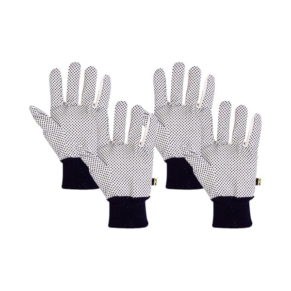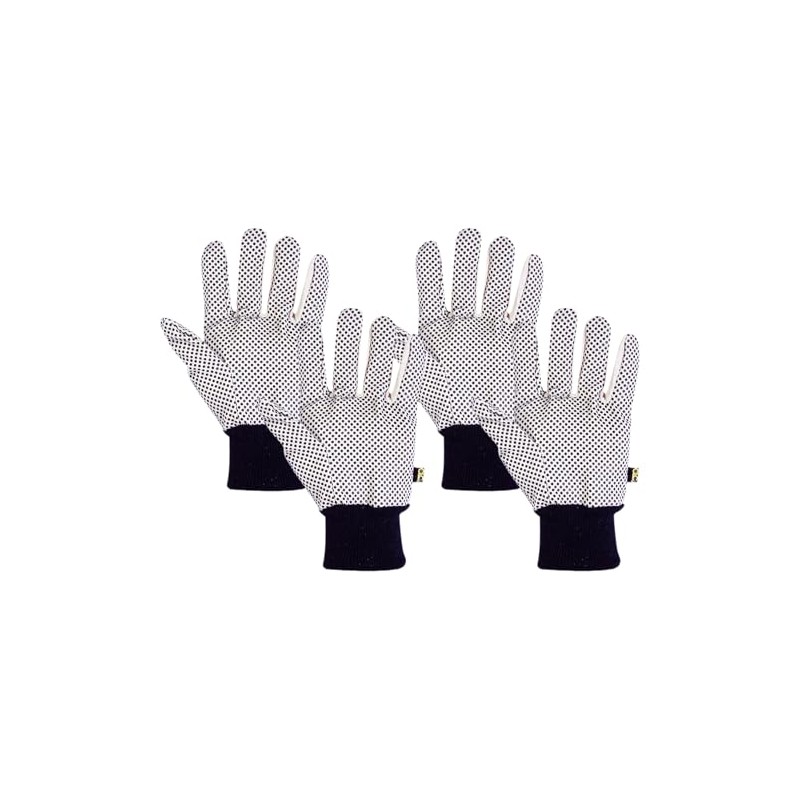 Standard weight cotton canvas work gloves made form a cotton/polyester blend with over lock black knit wrists and PVC gripper dots on the palm and fingers.