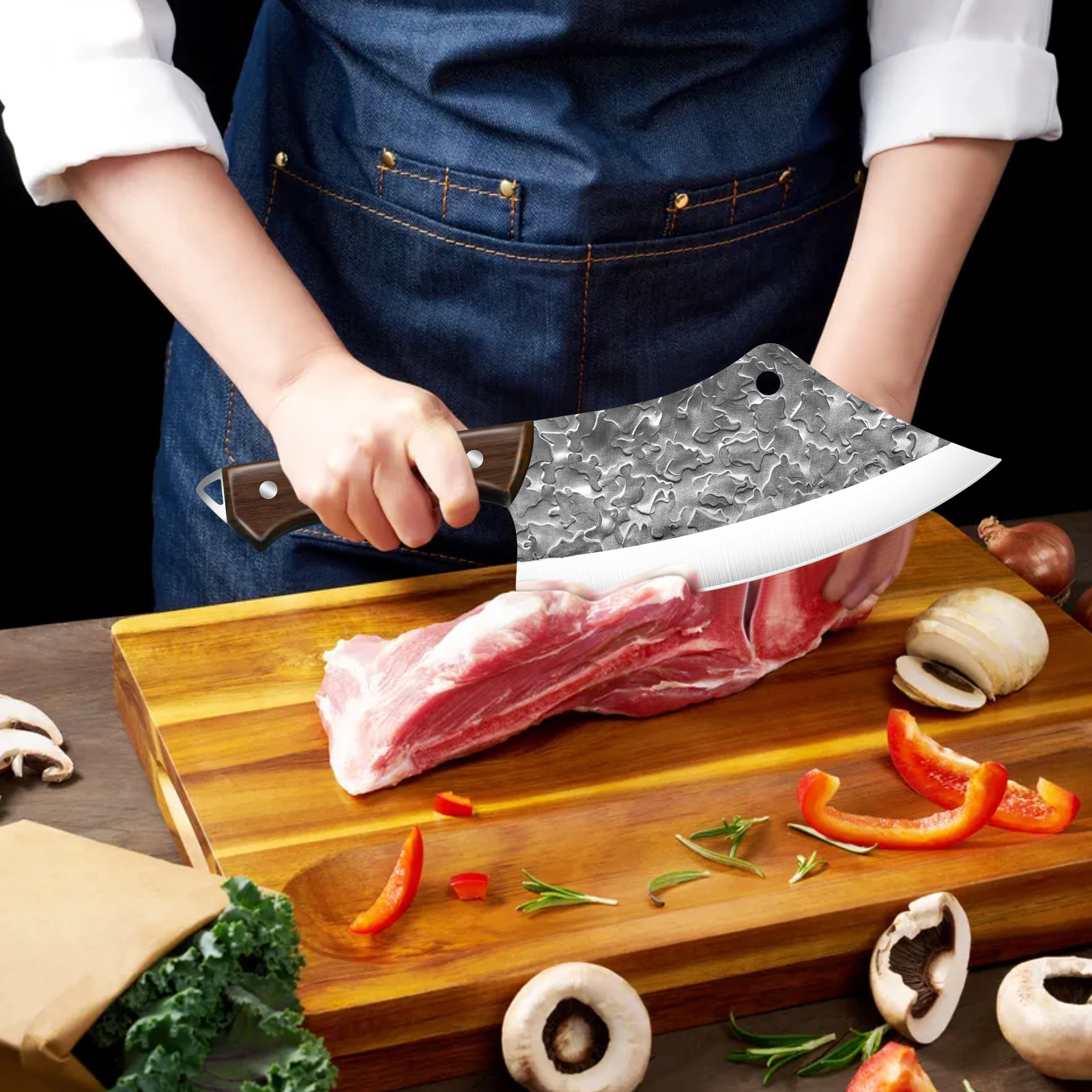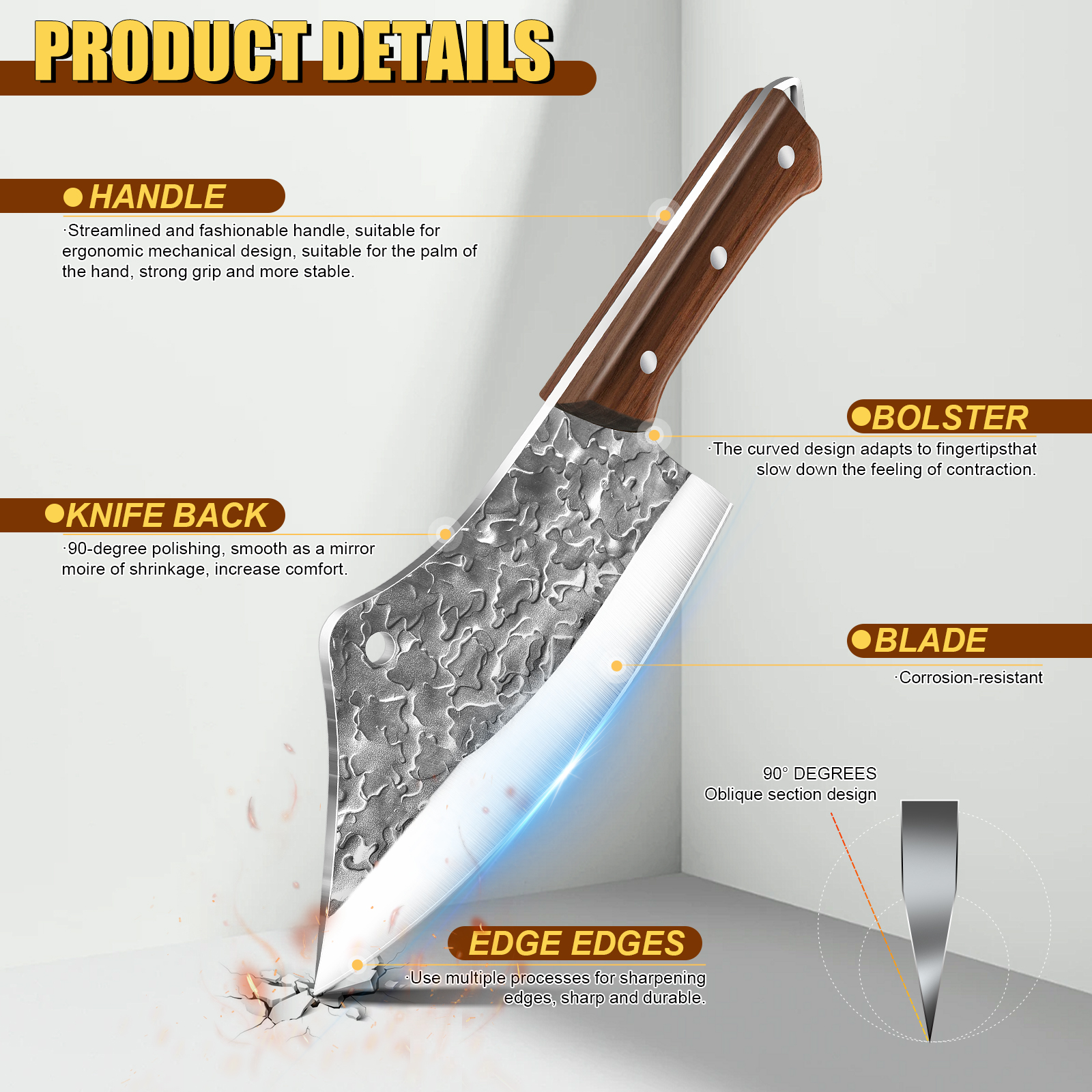- Wooden Handle -- Ergonomic handle can prevent the blade comfortable to grip and non-slip effect. The kitchen cleaver butcher knife is a great beauty, impeccable performance this strong design with a good strength, durability. Master Chef's Knife: Ideal for bread, veggies, fillets, and meats. Perfect for home and pro use. Elevate your kitchen skills!