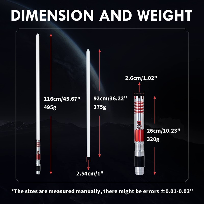 - đ„ăAluminum Hilt+Sturdy BladeăThe red hilt of the light saber was made of metal aluminum, fully consider the gravity effect of light saber and comfortable grip due to nice polished.High-impact PC blade,92cm, not easy to fold or bend, resistant to blows.Heavier than the blade on the market, supports heavy light saber dueling.