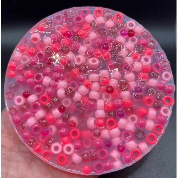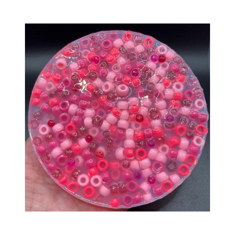 These pads are 5 inches wide and 1/2 inch thickness. Silicone has no odor or color and is safe for the youngest pickers. The pads are a one time use product. The beads can be used for crafting after they have been picked out. Included in the package is a length of stretchy string to make a bracelet or necklace from the beads.