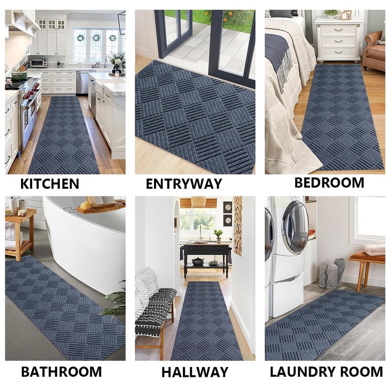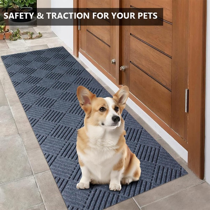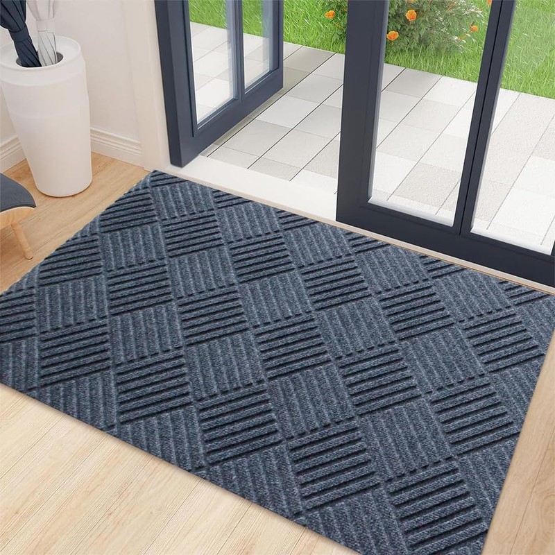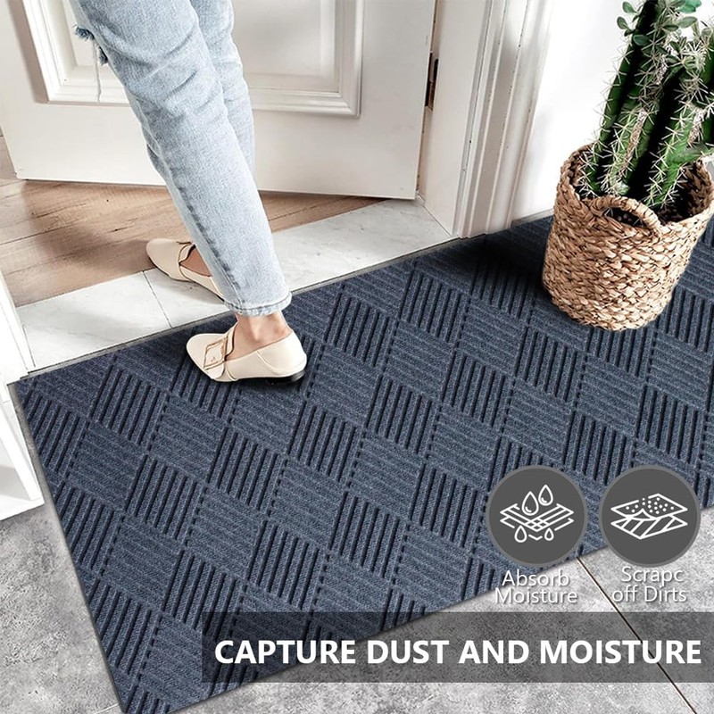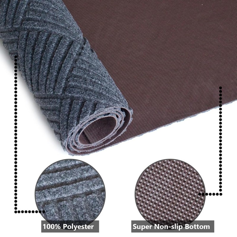 - Capture Dirt and Mud - The surface of the indoor outdoor mat adopts a groove design with the pattern, forming a detention dam extending in all directions, helping to capture dirt, dust, gravel, mud, sand, grass or other messy debris and prevent them from entering the Indoor; The surface of floor mat beautifully woven polyester fabric absorbs moisture, and the durable oblique rubber edge will not accumulate water in rainy and snowy days, keeping your home dry and clean.
