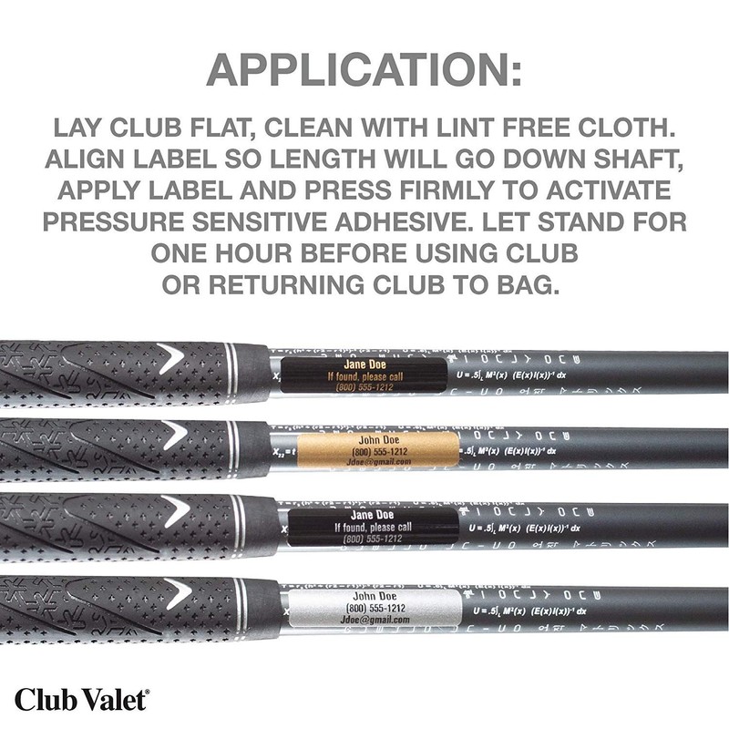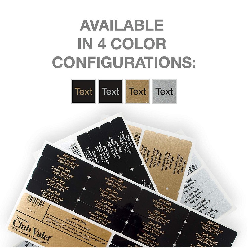 - 24 Durable Tags: There are 24 customized golf labels in your kit. Our labels are available in classic color combinations of Gold, Silver and Black. (16) 2 1/16” x ½" labels ideal for Clubs, Bags, Tool identification, Sporting Goods, etc. and (8) 2 3/16” x 3/8” labels great for helmets, sunglasses and anything easy to misplace.