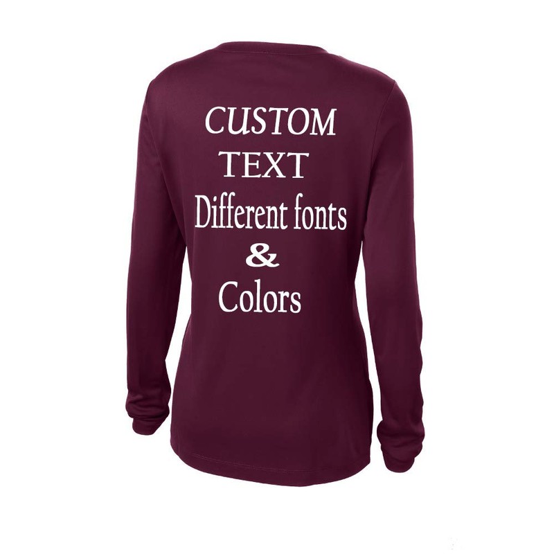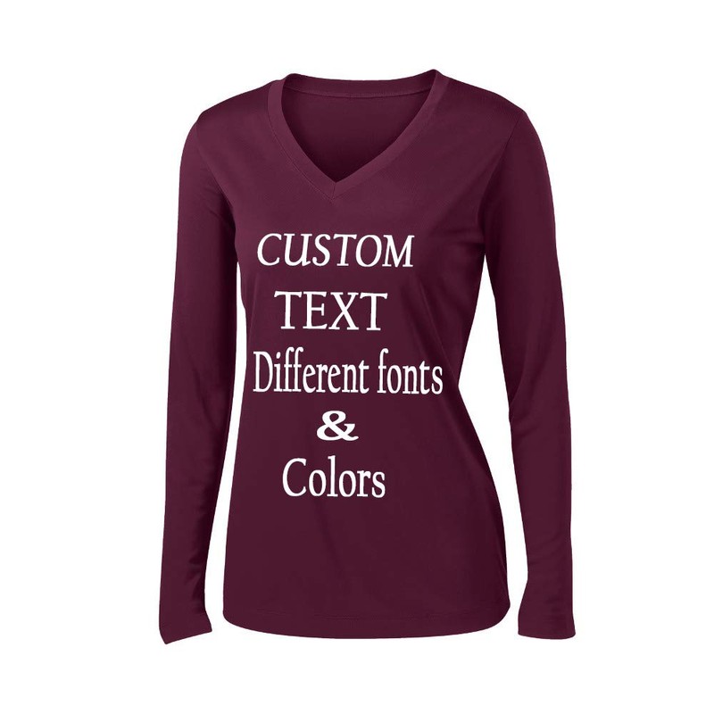 Customized Long Sleeve Polyester Ladies V Neck Tee Personalize with Your Own Text Font Design and Colors Maroon