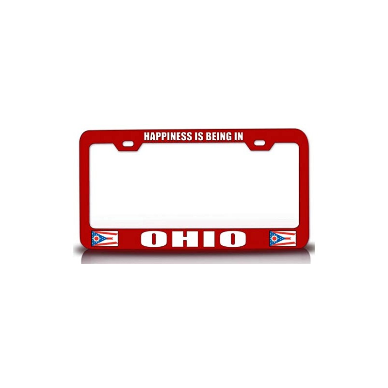 Customola - Happiness is Being in Ohio w/Flag State Flag Steel Metal License Plate Frame Red