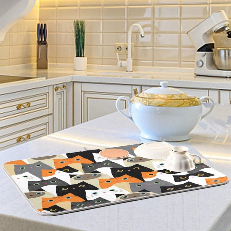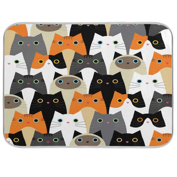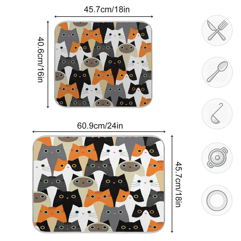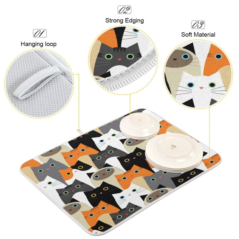 Cute Animal Cat Pattern Dish Drying Mat Microfiber Ultra Absorbent Reversible Hanging Drainer Pad for Kitchen Counter Washable Large 16x18 inch