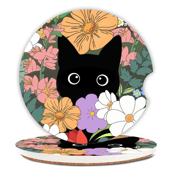 Cute Black Cat Car Coasters for Drinks Absorbent, 2 Pack Cup Holders, 2.56" Ceramic Stone & Non-Scratch Cork Base Coasters, Auto Accessories for Women & Men