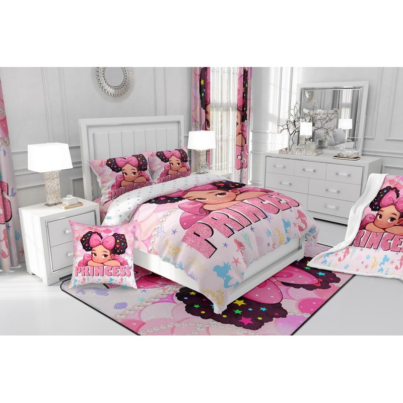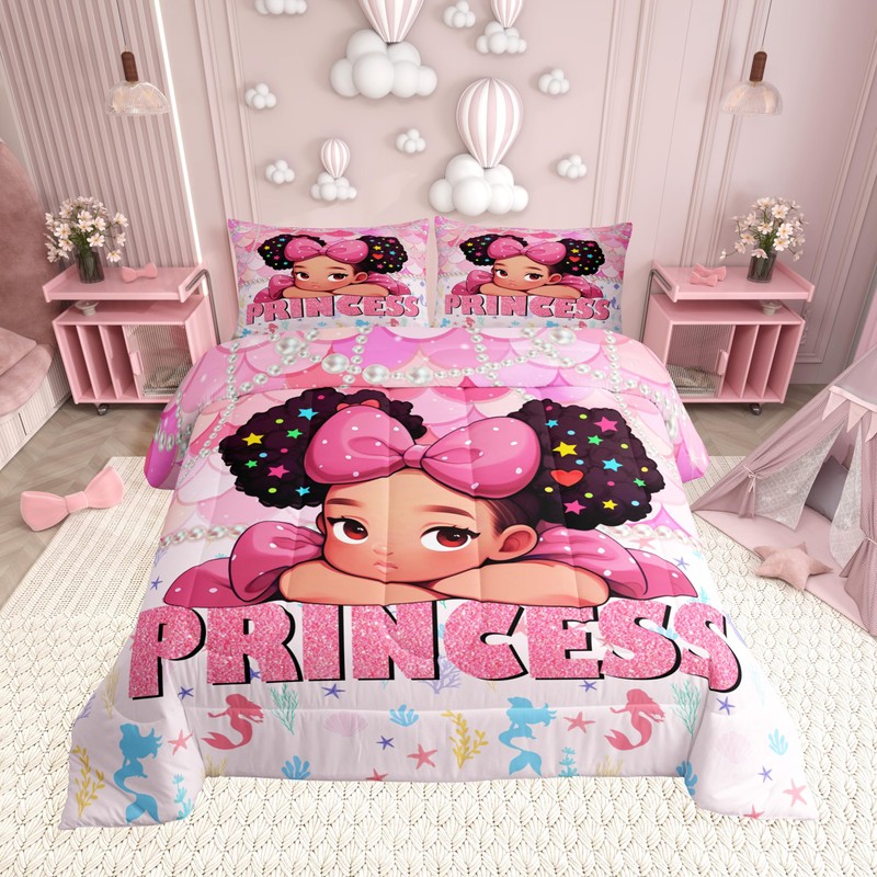 Cute Black Girls Comforter Set Full Size,Mermaid Pink Bedding Set,Cartoon Glitter Princess Kids Down Comforter Teens Africa Theme American Duvet Insert Sweet Dots Print Reversible,2 Pillowcases